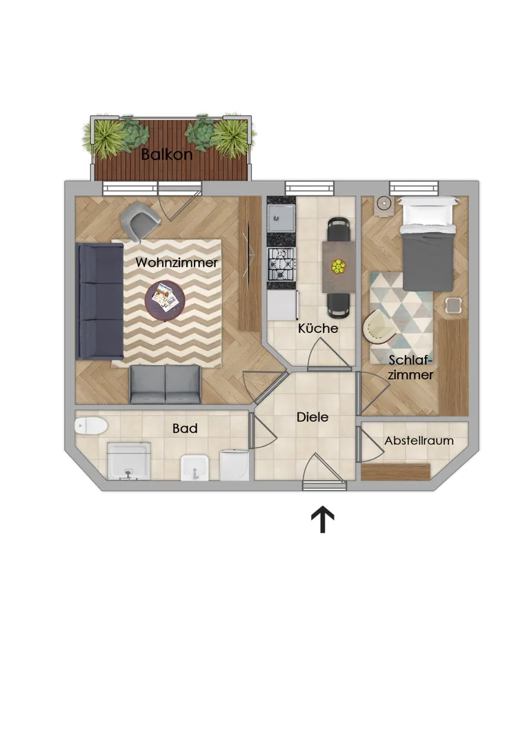 Wohnzimmer mit Zugang zum Balkon, Schlafzimmer, Küche mit Einbauküche, Bad mit Dusche, Diele, Abstellraum
