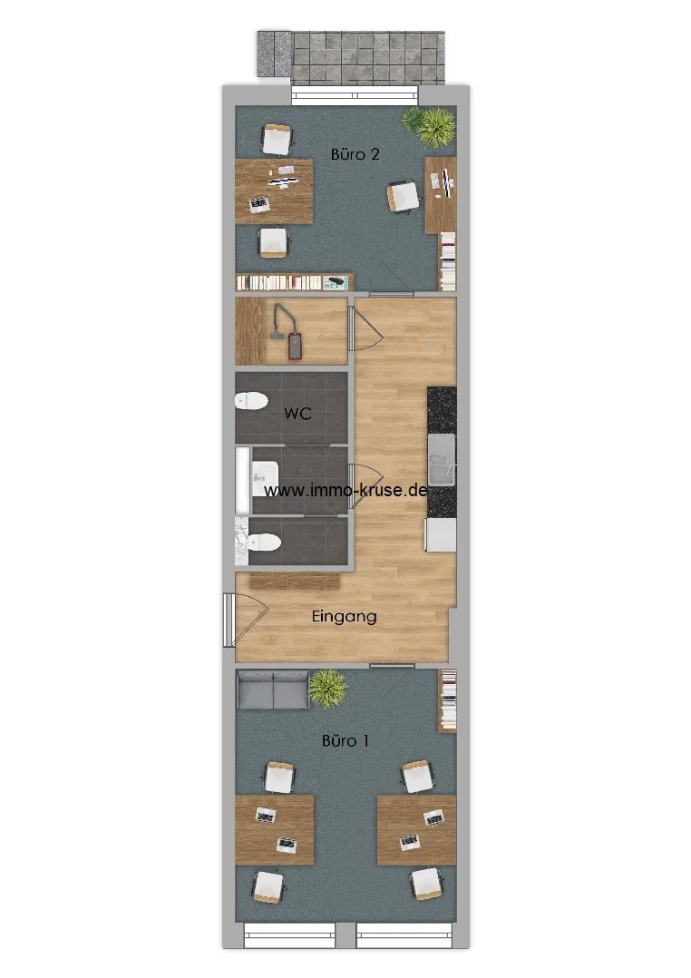 Die Gewerbefläche umfasst ca. 57,47 m² und bietet zwei Büros, einen Eingangsbereich mit Einbauküche sowie WCs und einen praktischen Abstellraum.
