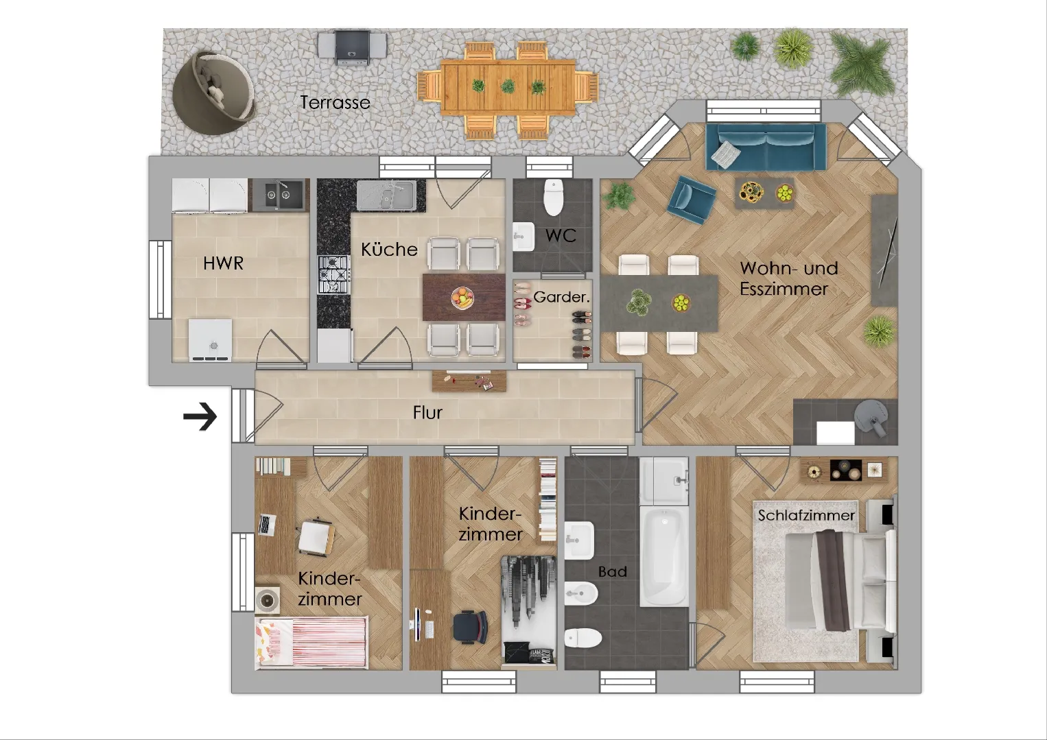 Der einladende Eingangsbereich führt Sie in einen hellen und freundlichen Wohnbereich, der mit einem großzügigen Wohnzimmer mit Zugang zum Außenbereich begeistert. Der gemütliche Kaminofen sorgt für eine wohlige Atmosphäre und lädt zu entspannten Abenden im Kreise Ihrer Liebsten ein.