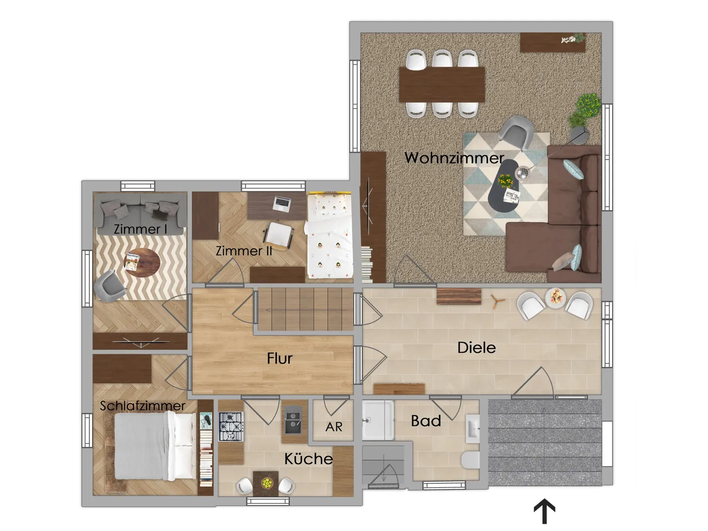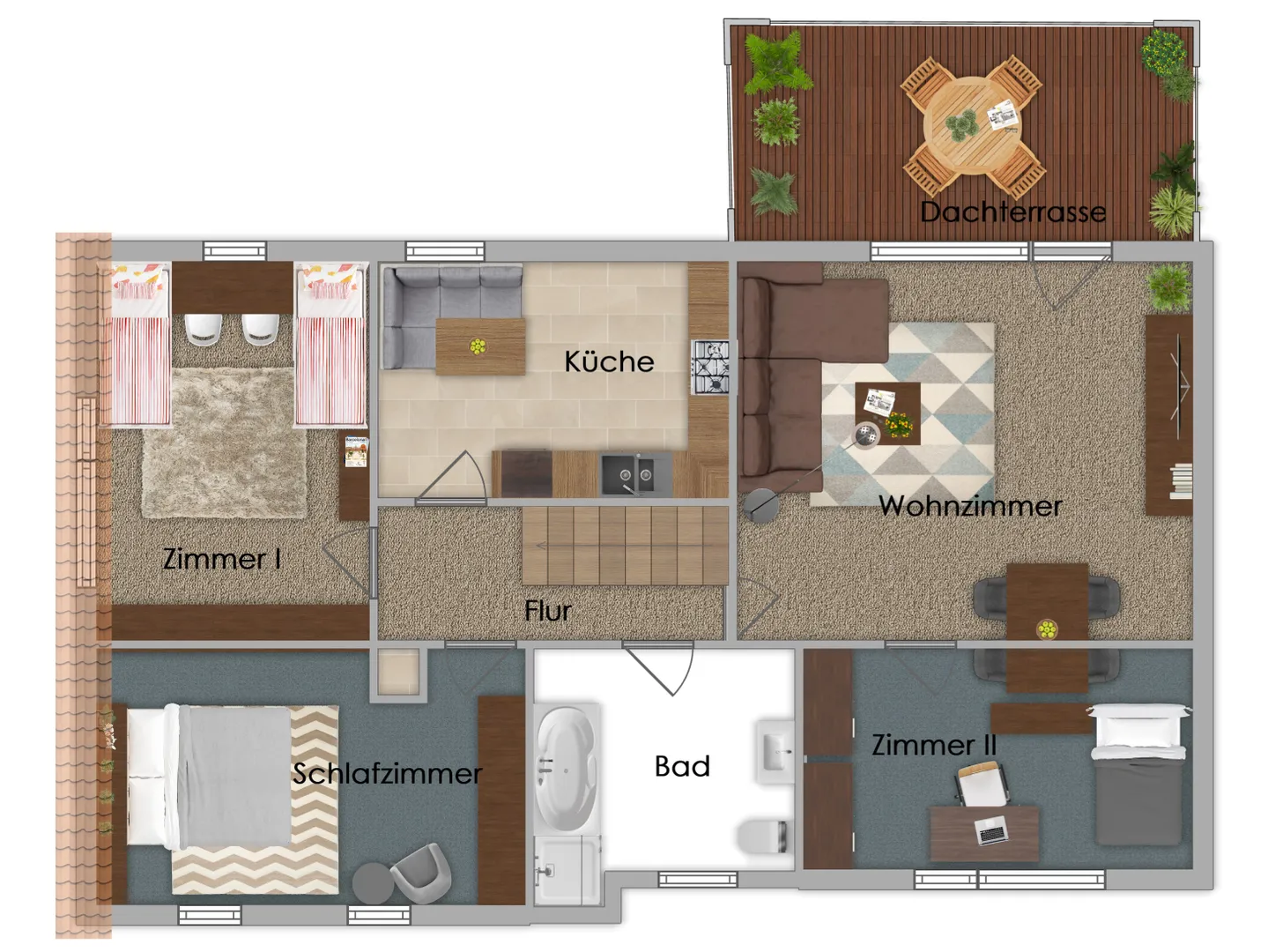 - Fußböden mit Laminat, Fliesen bzw. Teppichbelag