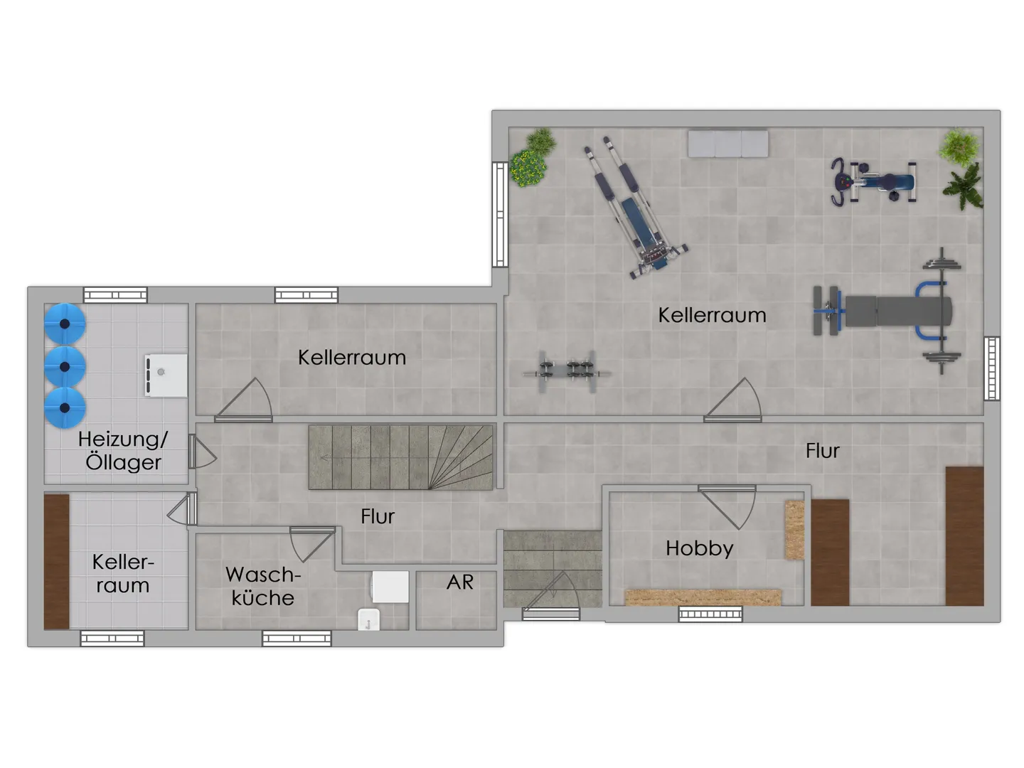 Das Kellergeschoss bietet auf ca. 94,73 m² zusätzliche Nutzfläche. Hier befinden sich 3 Kellerräume, ein Heizungsraum/Öllager, die Waschküche, ein Abstellraum sowie ein Hobbyraum.