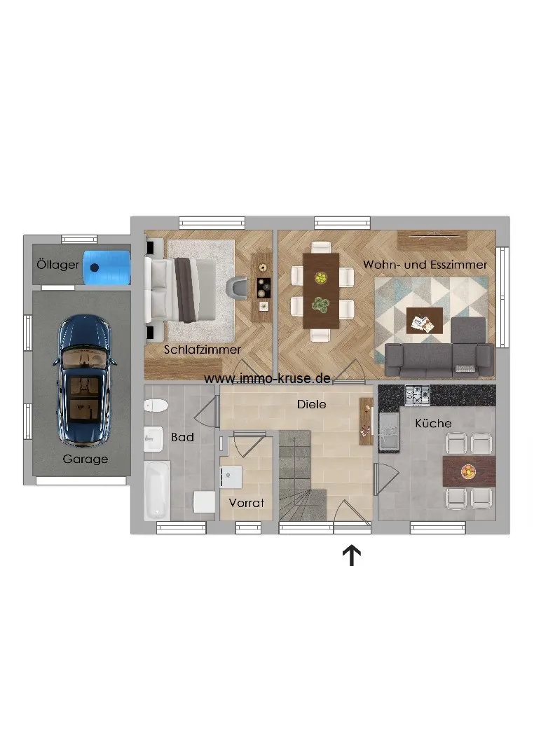 Im Erdgeschoss gelangen Sie über eine zentrale Diele in alle Räume. Hier befinden sich ein lichtdurchflutetes Wohn- und Esszimmer mit direktem Zugang zur Terrasse, ein Schlafzimmer, die Küche, ein Badezimmer mit Badewanne sowie ein praktischer Abstell- bzw. Vorratsraum.