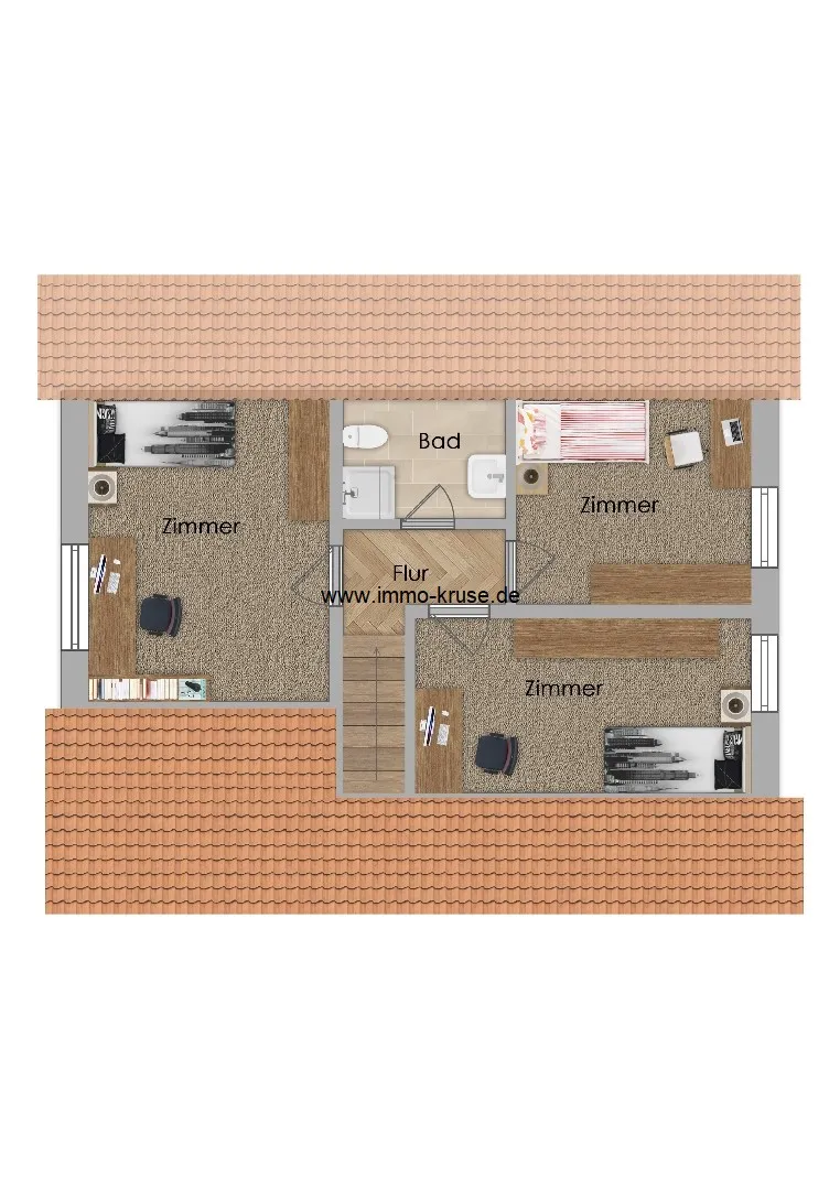 Das Dachgeschoss bietet drei weitere Zimmer, die flexibel als Kinder-, Gäste-, Arbeits- oder Schlafzimmer genutzt werden können. Ein zusätzliches Badezimmer mit Dusche rundet das Raumangebot auf dieser Ebene ab.