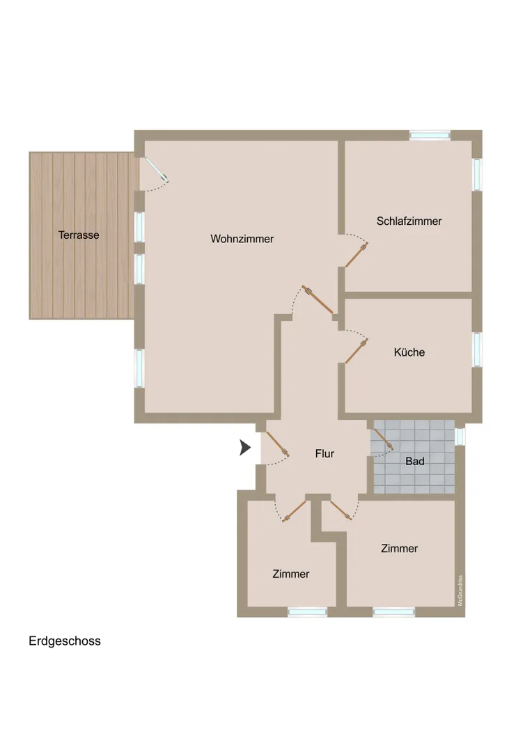 Auf ca. 88,68 m² Wohnfläche verteilen sich die Räumlichkeiten im Erdgeschoss auf das Wohnzimmer mit Zugang zur überdachten Terrasse, das Schlafzimmer, 2 kleine Zimmer, der Küche mit Einbauküche (ohne E-Herd) und dem Bad sowie dem Flur.