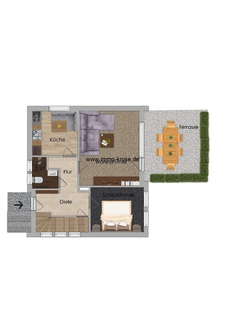 Im Erdgeschoss erwartet Sie ein helles Wohnzimmer mit direktem Zugang zur Terrasse, die mit einer Sonnenmarkise ausgestattet ist und zu entspannten Stunden im Freien einlädt. Angrenzend befindet sich das Schlafzimmer. Die zwischen Wohn- und Schlafzimmer errichtete Leichtbauwand kann mit geringem Aufwand entfernt werden, sodass beispielsweise ein großzügiger Wohn- und Essbereich realisiert werden könnte. Die Küche ist mit einer hellen Einbauküche ausgestattet und bietet einen freundlichen Arbeitsbereich. Das modernisierte Duschbad aus dem Jahr 2016 verfügt über eine bodengleiche Dusche sowie ein Tageslichtfenster. Ergänzt wird das Raumangebot im Erdgeschoss durch Diele und Flur.