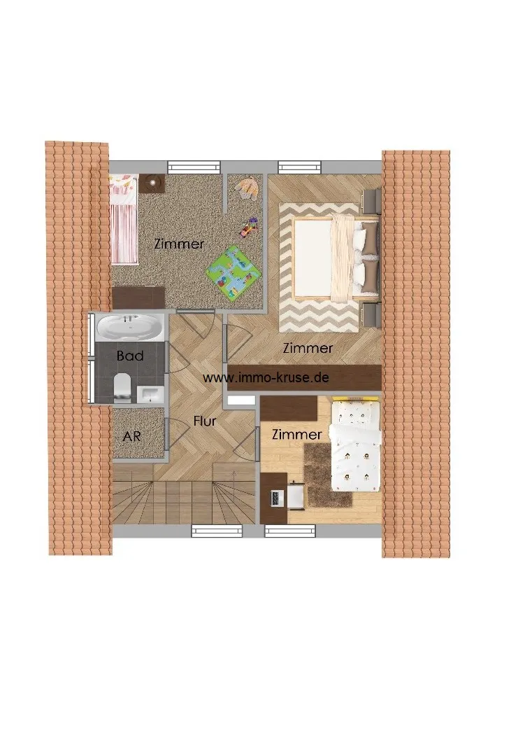 Im Dachgeschoss stehen drei weitere Zimmer zur Verfügung, die flexibel als Schlaf-, Kinder-, Gäste- oder Arbeitszimmer genutzt werden können. Ein kleiner Abstellraum sorgt für zusätzliche Staufläche. Das Wannenbad mit Tageslichtfenster rundet diese Etage funktional ab.
