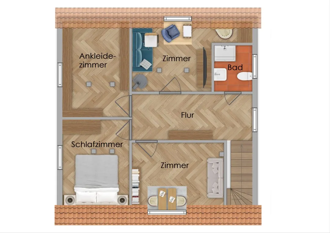 Im Dachgeschoss erwarten Sie weitere großzügige Räume mit sichtbaren Holzbalken, die den rustikalen Charakter des Hauses unterstreichen. Neben einem Schlafzimmer stehen ein Ankleidezimmer sowie zwei flexibel nutzbare Räume zur Verfügung, beispielsweise als Arbeits-, Hobby- oder Gästezimmer. Ein weiteres Zimmer ist ebenfalls mit einem Kaminofen ausgestattet und eignet sich ideal als gemütlicher Rückzugsort. Ein zusätzliches Duschbad sowie weitere Nutzfläche im Spitzboden runden das Raumangebot ab.