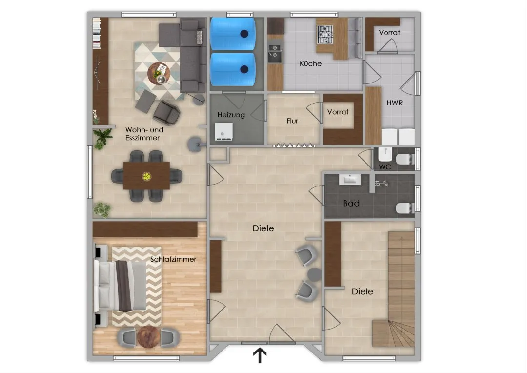 Auf einer großzügigen Wohnfläche von ca. 224 m² bietet die Immobilie ein durchdachtes Raumkonzept mit hellen und freundlichen Wohnbereichen. Das großzügige Wohn- und Esszimmer mit großer Fensterfront sowie Kaminofen schafft eine angenehme und wohnliche Atmosphäre. Die Küche ist funktional ausgestattet und verfügt über eine Kochinsel. Im Erdgeschoss befinden sich zudem ein Schlafzimmer, ein modernes Duschbad mit bodengleicher Dusche, ein Gäste-WC sowie praktische Hauswirtschafts- und Vorratsräume.
