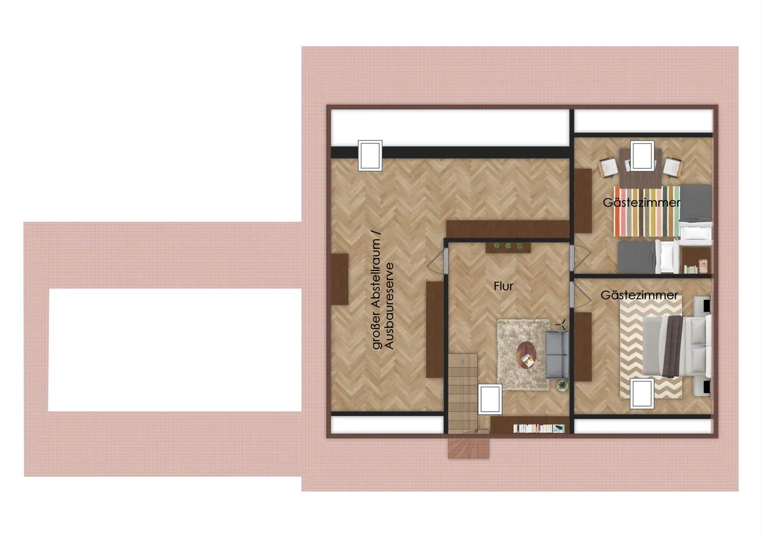 DG: 2 Gästezimmer, großer Abstellraum / Ausbaureserve (Anschlüsse für Bad, Heizung und Strom bereits vorbereitet), Flur