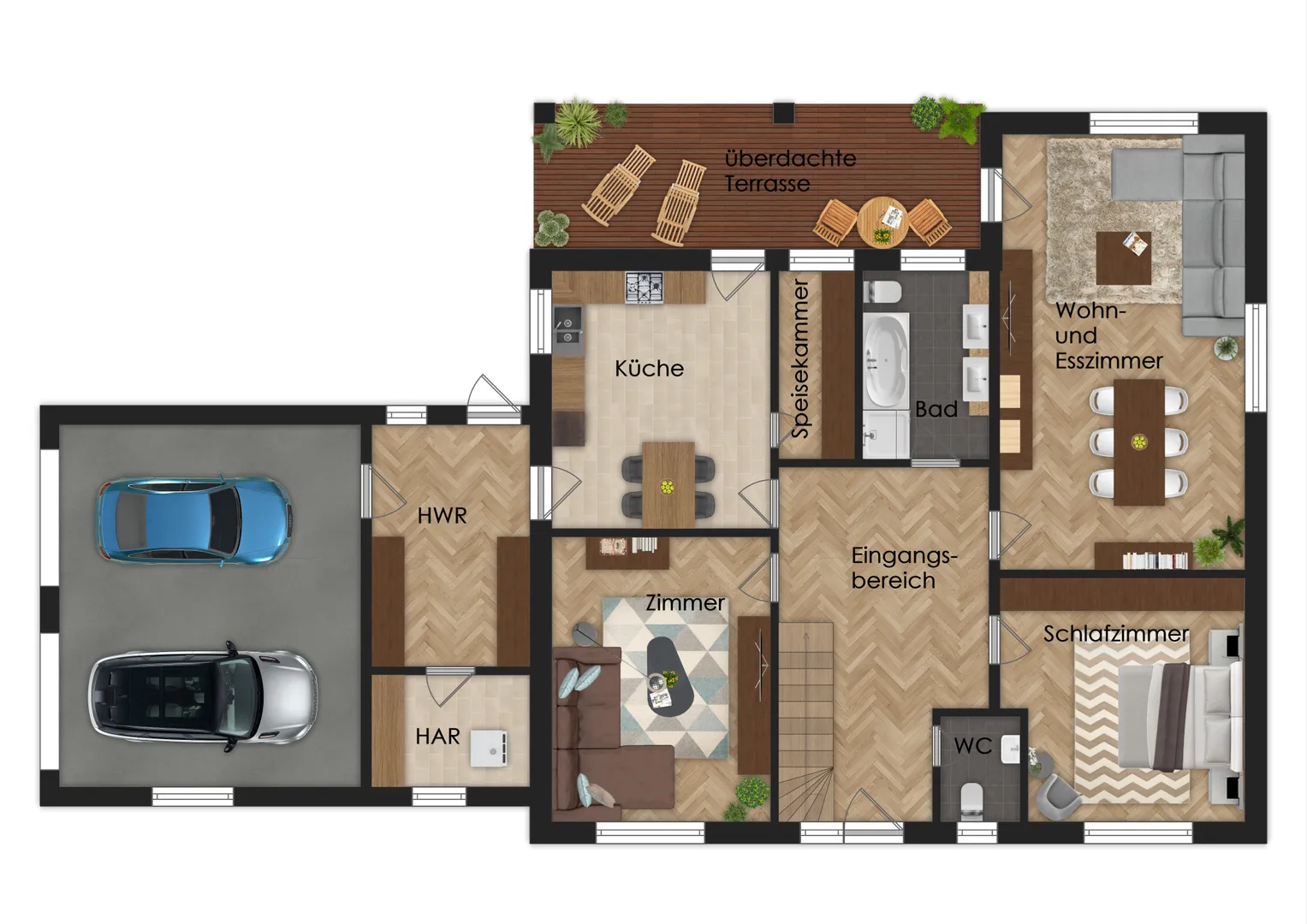 EG: Wohn- und Esszimmer, Schlafzimmer, Zimmer, Küche mit Einbauküche, Vollbad, Gäste-WC, Eingangsbereich, Speisekammer, überdachte Terrasse (Zugang vom Wohn- und Esszimmer sowie Küche)