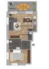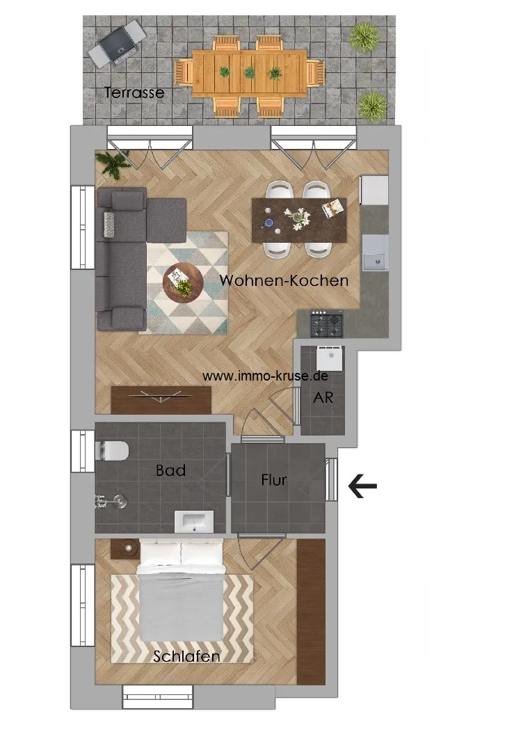Die Wohnfläche von ca. 58,26 m² verteilt sich auf einen kleinen Eingangsbereich, einen hellen Wohn- und Kochbereich mit offener Küche und moderner Einbauküche sowie Zugang zur Terrasse, ein gut geschnittenes Schlafzimmer und ein modernes Tageslichtbad mit bodengleicher Dusche und Regendusche. Ein Abstellraum bietet zusätzlichen Stauraum