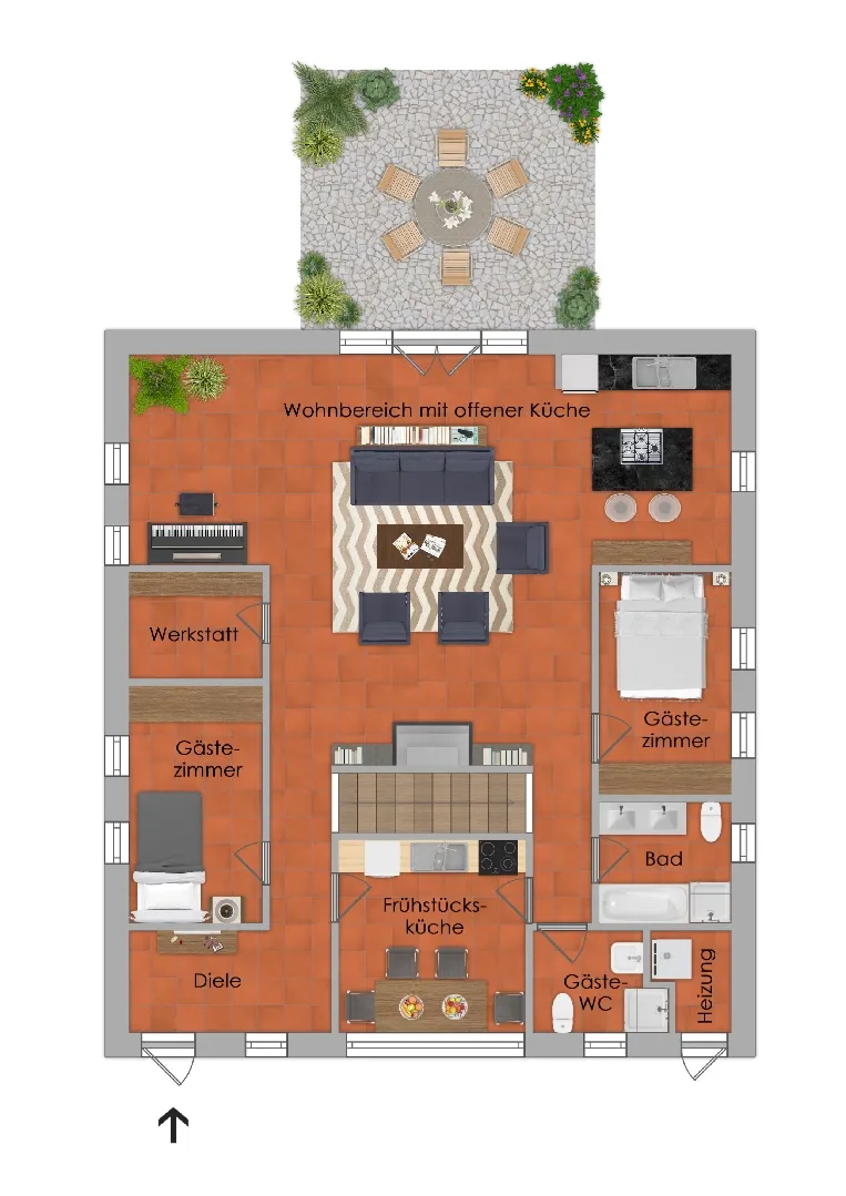 Zwei flexibel nutzbare Zimmer im Erdgeschoss eignen sich als Arbeits-, Gäste- oder Hobbyräume. Das großzügige Badezimmer ist mit Wanne und begehbarer Dusche ausgestattet, ein zusätzliches Gäste-Bad mit Dusche komplettiert das Raumangebot. Werkstatt, Heizungsraum und ein praktischer Nebeneingang runden das Erdgeschoss ab.