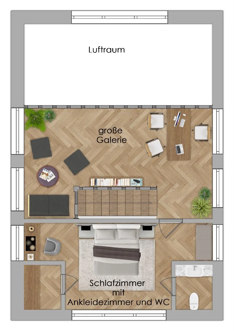Das 2002 ausgebaute Dachgeschoss besticht durch eine offene Galerie - ideal als Atelier, Homeoffice oder Rückzugsort. Angrenzend finden Sie Schlafzimmer, Ankleidezimmer und ein separates WC. Große Gaubenfenster sorgen für viel Tageslicht und ein freundliches Ambiente.