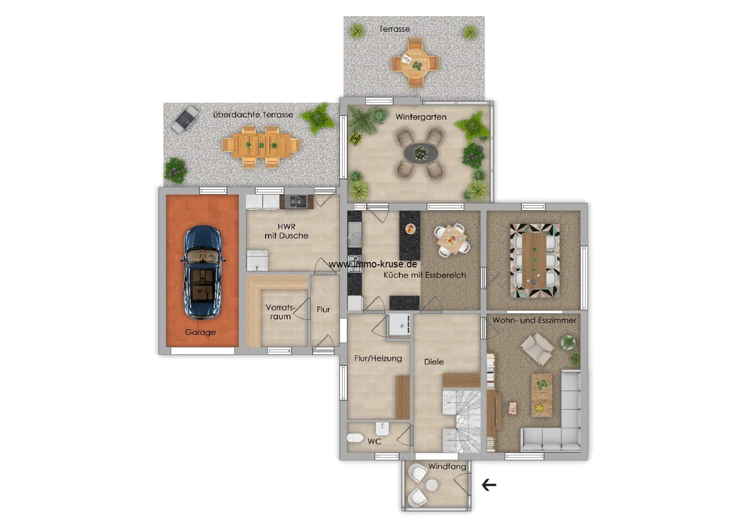Zusätzlich finden Sie im Erdgeschoss ein Gäste-WC, einen praktischen Hauswirtschaftsraum mit separater Dusche sowie einen Vorratsraum. Der Windfang, die Diele und die Flure bieten weiteren Komfort und Raum für Ihre individuellen Gestaltungsideen.