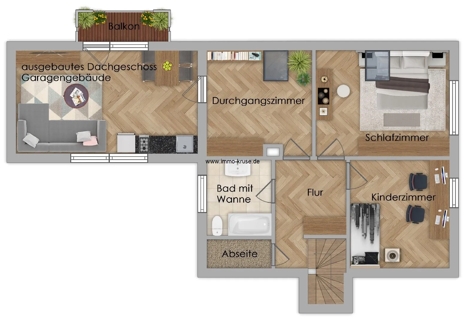 Über eine offene Steintreppe gelangen Sie in den Flur des Dachgeschosses, wo sich ein Schlafzimmer, ein Kinderzimmer sowie ein Badezimmer mit Badewanne befinden. Ein Durchgangszimmer führt zum ausgebauten Dachgeschoss über der Garage, das Ihnen vielfältige Nutzungsmöglichkeiten eröffnet - sei es als Arbeits-, Wohn-, Sport- oder Hobbyraum. Der Balkon gewährt Ihnen einen herrlichen Ausblick über das Grundstück und lädt zum Entspannen ein.