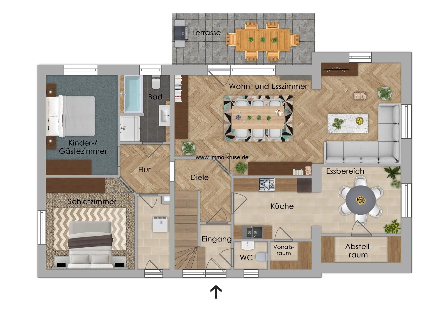 Im Erdgeschoss befindet sich eine großzügige, helle Wohnung mit ca. 123 m² Wohnfläche. Sie umfasst ein weitläufiges Wohn- und Esszimmer mit Zugang zur überdachten Terrasse, eine Küche mit angrenzendem Essbereich, Schlafzimmer, Kinderzimmer, Vollbad, Gäste-WC, Vorrats- und Abstellräume.