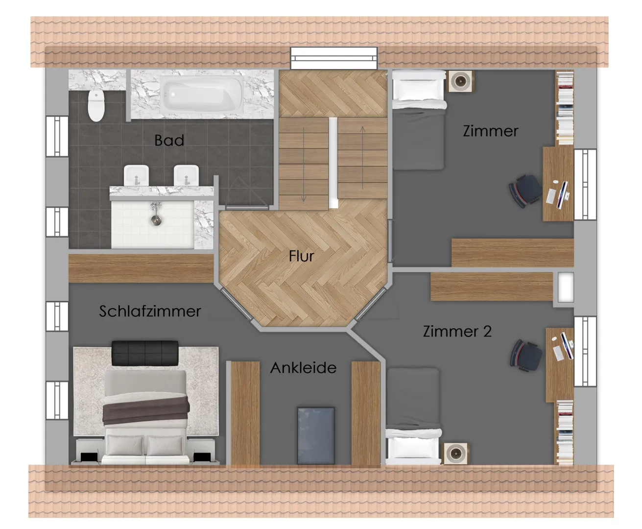 Über die Diele erreichen Sie im Erdgeschoss den großzügigen Wohn- und Essbereich mit Kaminofen und offener Küche mit hochwertiger Einbauküche, das Büro-/Gästezimmer, das Gäste-WC mit ebenerdiger Dusche sowie den Hauswirtschaftsraum. Über eine untermauerte Betonwinkelstufentreppe gelangen Sie in den Flur des Dachgeschosses. Dort befindet sich das Schlafzimmer mit Zugang zum Ankleidezimmer, 2 Zimmer sowie das moderne Bad mit 2 Handwaschbecken, ebenerdiger Dusche und Badewanne.