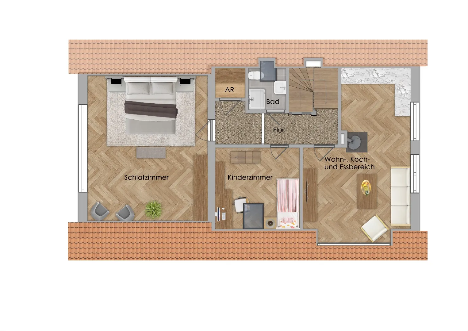 Die Wohnfläche von ca. 146,41 m² verteilt sich auf das Erd- und Dachgeschoss. Zusätzlich steht ein ausgebauter Spitzboden als praktische Nutzfläche zur Verfügung - ideal z. B. als Hobbyraum, Stauraum oder Rückzugsort.