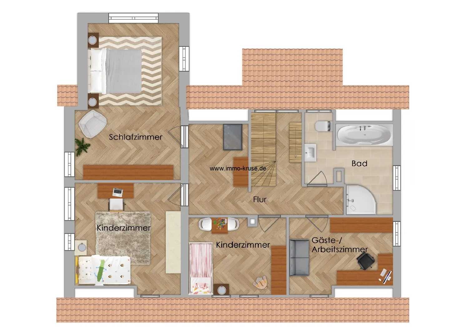Im Dachgeschoss stehen ein großes Schlafzimmer, zwei Kinderzimmer, ein Gäste- bzw. Arbeitszimmer sowie ein Vollbad mit Tageslicht zur Verfügung. Zusätzlich bietet der ausgebaute Spitzboden einen perfekten Ort für Hobby, Spiel oder als ruhigen Rückzugsbereich.
