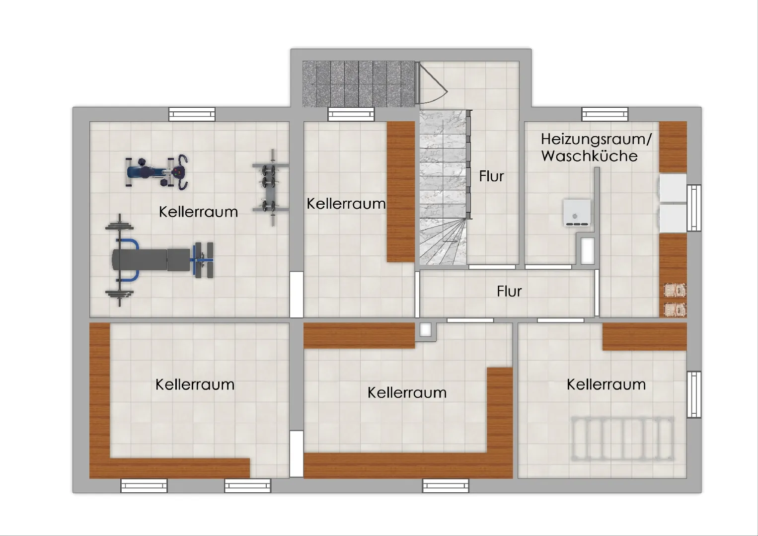 Der Vollkeller mit ca. 88,48 m² Nutzfläche bietet vier weitere Räume, einen Heizungs- bzw. Hauswirtschaftsraum sowie einen Flur und schafft damit viel praktischen Stauraum.