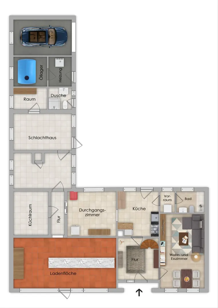 Im Erdgeschoss stehen neben der ehemaligen Gewerbefläche – zuletzt als Ladengeschäft mit großzügiger Fensterfront genutzt – auch Wohnräume zur Verfügung. Der Verkaufsraum ist hell und gut einsehbar und verfügt über einen direkten Zugang von außen. Ergänzt wird der gewerbliche Bereich durch Nebenflächen wie Kühl- und Arbeitsräume, die vielfältige Nutzungsmöglichkeiten bieten .
