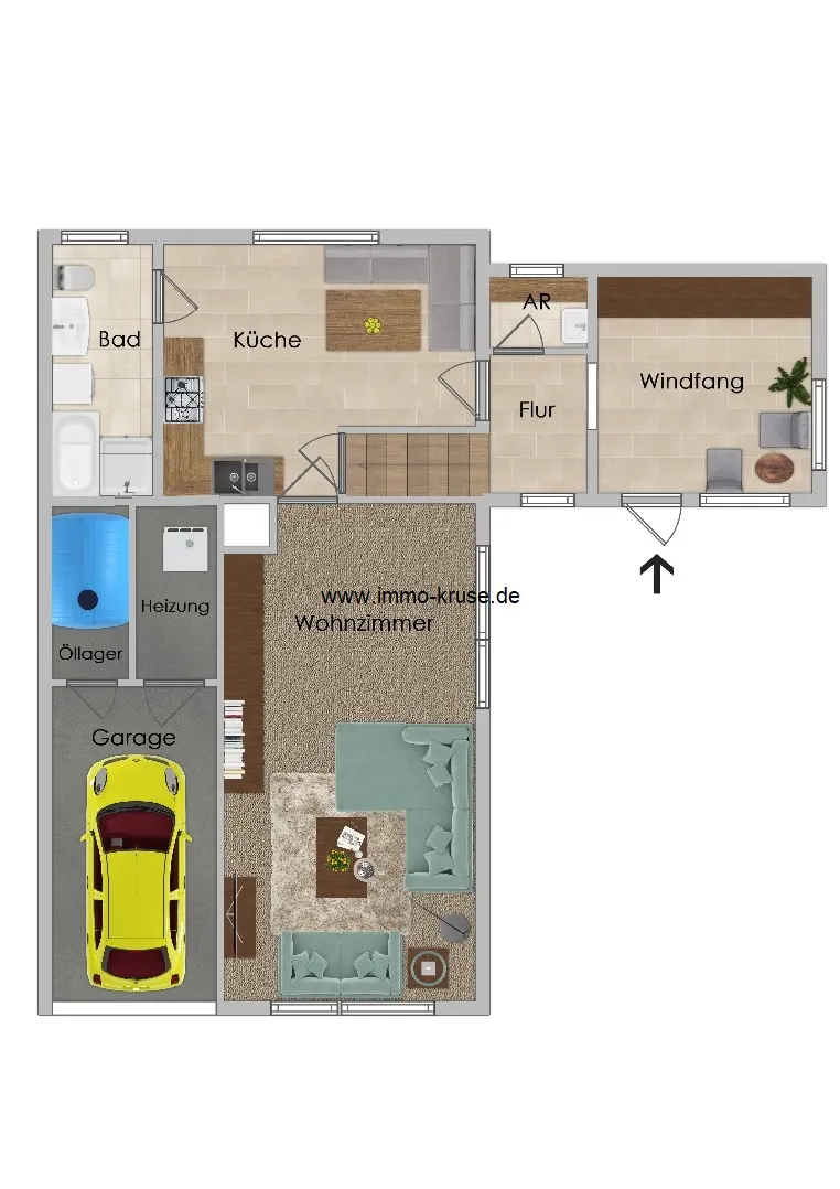 Zusätzlich steht eine direkt ins Haus integrierte Garage mit Heizungsraum und Öllager zur Verfügung. Ein kleiner Abstellraum, beispielsweise zur Unterbringung von Fahrrädern, sowie ein kleiner Terrassenbereich ergänzen das Angebot.