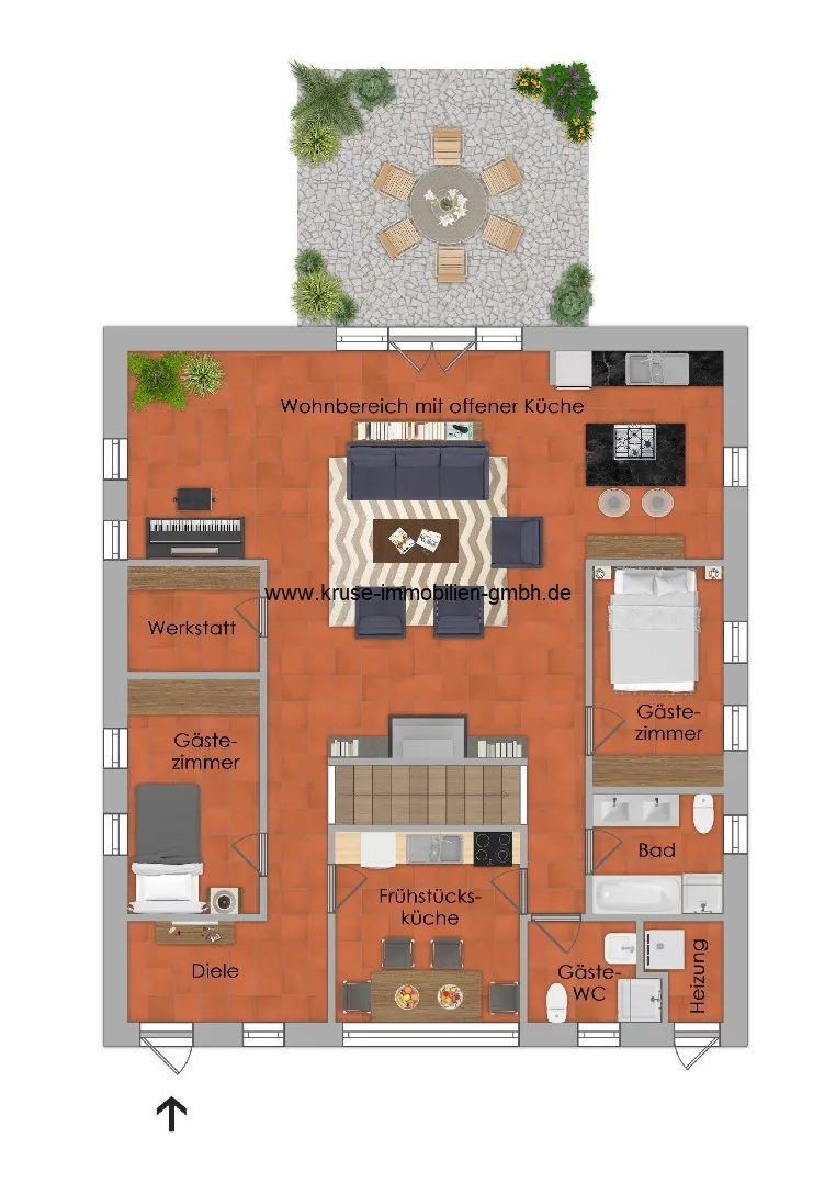 Die Frühstücksküche im vorderen Bereich des Hauses ist der perfekte Ort, um den Tag zu beginnen. Zudem erwarten Sie im Erdgeschoss zwei Gästezimmer, ein Bad mit Badewanne und begehbarer Dusche, ein Gäste-WC mit Dusche sowie eine kleine Werkstatt. Der separate Heizungsraum ist über den Nebeneingang erreichbar.