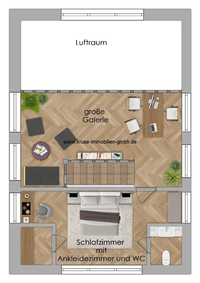 Im Jahr 2022 wurde das Dachgeschoss zu einem offenen Galeriebereich umgebaut. Zusätzlich befindet sich hier ein Schlafzimmer mit angrenzendem Ankleidezimmer und WC. Großzügige Gaubenfenster verleihen den Räumlichkeiten viel Helligkeit und bieten vielfältige Nutzungsmöglichkeiten, wie z.B. das Ausüben von Hobby und Handwerk oder die Einrichtung eines Ateliers.