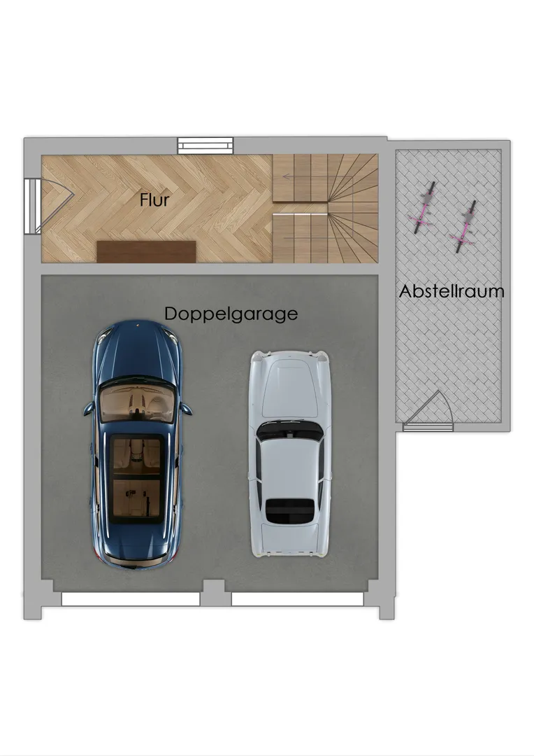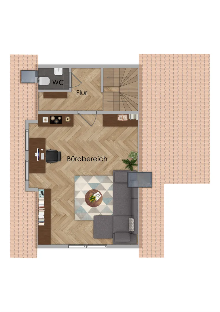 Das Erd- und Dachgeschoss bieten weitere ca. 89 m² Nutzfläche. Das Erdgeschoss besteht aus einer Parkfläche, welche mittels zwei Einzelgargentoren erreichbar ist, einem Abstellraum für Fahrräder und Gartengeräte, sowie dem separaten Büroeingang mit Treppenaufgang zu dem später ausgebautem Bürobereich. Das Dachgeschoss bietet ein WC, einen Flur und den geräumigen Bürobereich. Oder wollen Sie das Dachgeschoss für einen Fitnessbereich verwenden? Hier ist vieles möglich!
