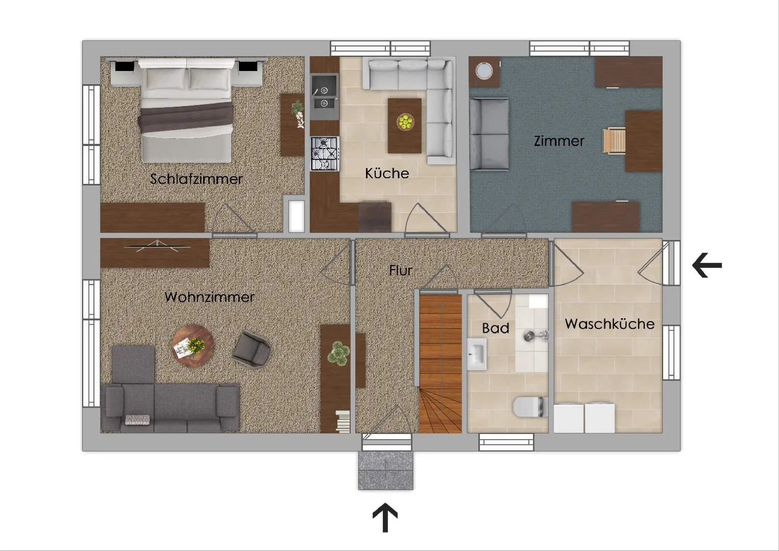 - geschlossene Holztreppe mit Teppichstufen ins Dachgeschoss