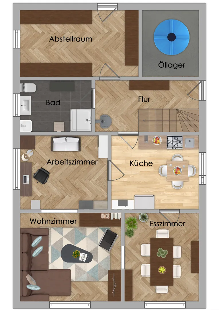 EG: Wohnzimmer, Esszimmer, Arbeitszimmer, Küche, Bad, Flur, Abstellraum